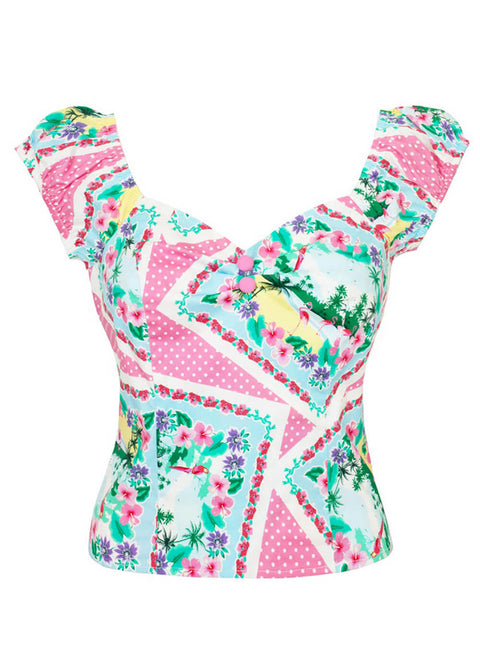 This Vavavoom piece is bursting with pastel pink patchwork vibes, floral patterns, and playful polka dots—it's as if you've just walked out of a vintage storybook. The bodice fits beautifully with a sweetheart neckline, featuring elastic sleeves that can be worn straight or off-shoulder. Have you spotted the flamingos yet?