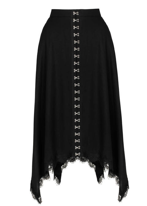 This skirt is dramatic, elegant, and a touch mysterious - just like you! With its flowing asymmetric hem, romantic lace trim, and decorative hook fastenings at the front, it will quickly become your favorite. Whether paired with a band tee, blouse, knitwear, or corset, Quinn effortlessly commands attention without you having to try too hard. ♥